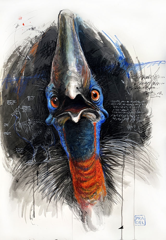 Cette série a été pensée à l’image des carnets d’études scientifiques des grands naturalistes, mêlant, dessin technique, croquis et notes typographique. Des textes, des chiffres, des croquis, du graphisme, une mise en page qui laisse apparaître l’étude, le cheminement de l’analyse, qui laisse place ensuite au personnage central, à l’interprétation artistique, toujours un peu décalée et hypnotisante. Le terrain de recherche du bestiaire me permet également d’investir de nouveaux champs autour de l’encre de Chine et de la couleur, remettant parfois en cause les usages habituels, avec le même objectif : développer le sujet de manière unique. J’observe, j’analyse, je gribouille, je traduis, je restitue, en cherchant la puissance émotionnelle propre à l’identité de chaque animal étudiée.
